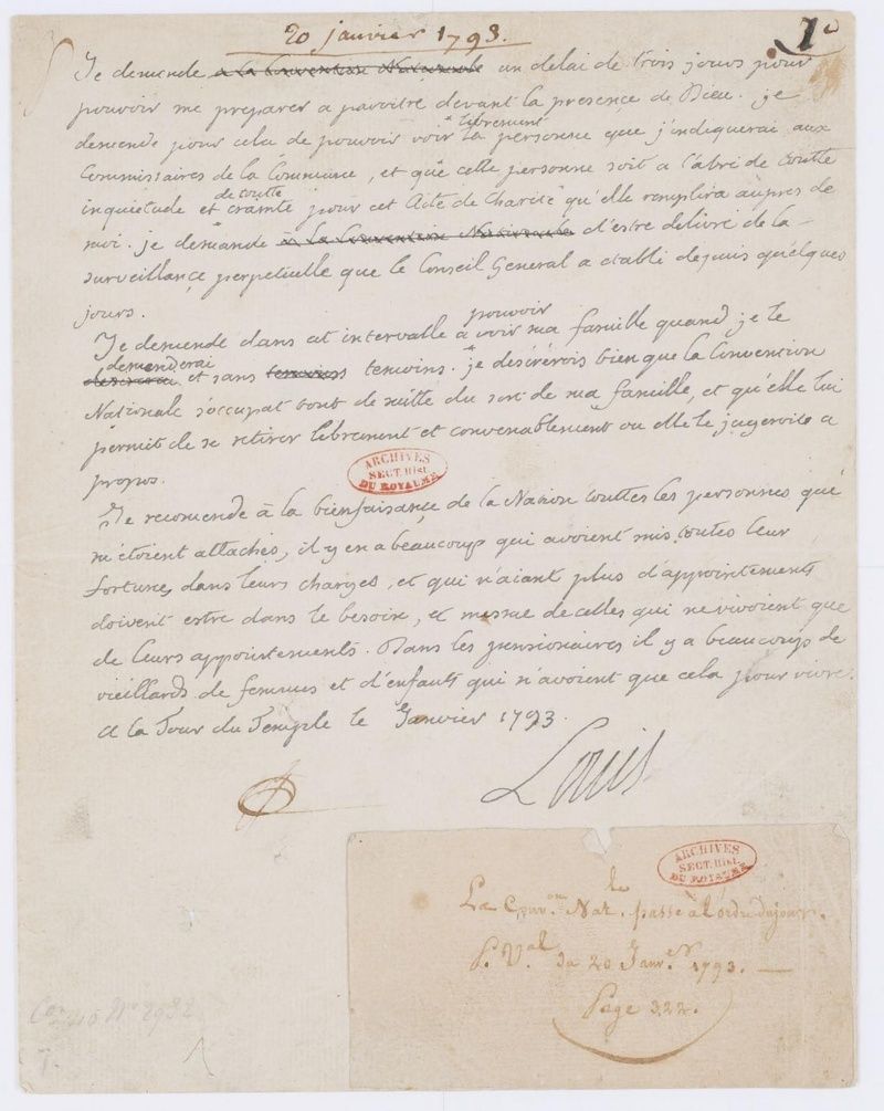 Dernière lettre de Louis XVI à la Convention en date du 20 janvier 1793, avant son exécution