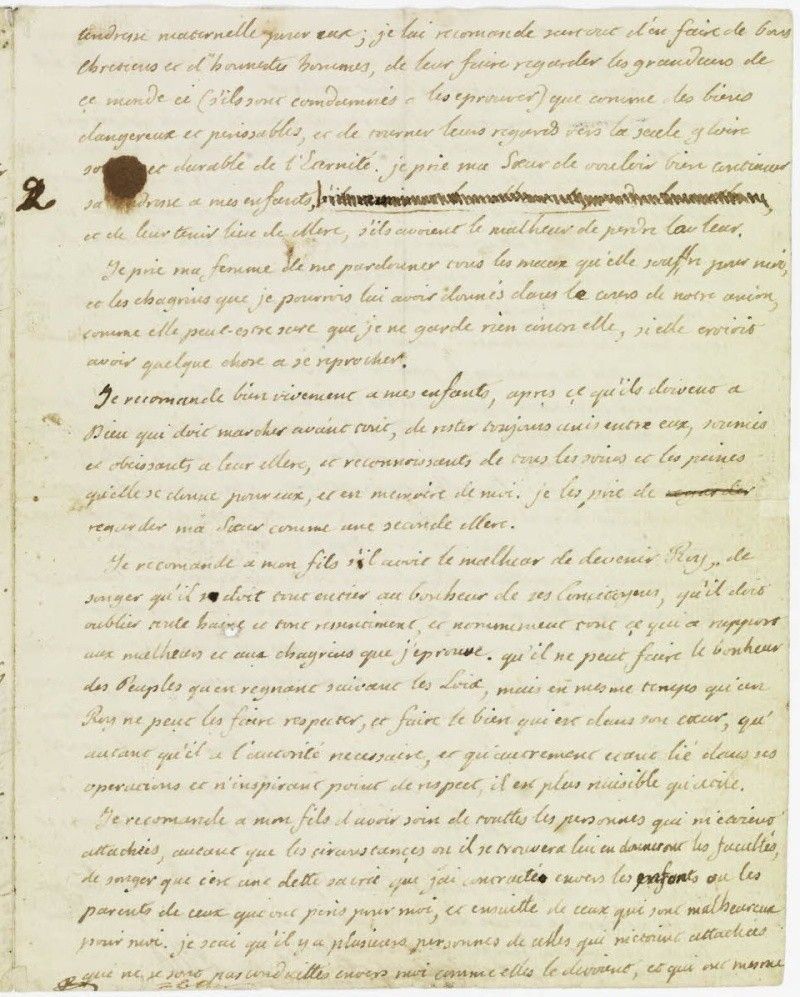 Je recommande à mon fils s'il avait le malheur de devenir Roi qu'il se doit tout entier au bonheur de ses concitoyens, qu'il doit oublier toute haine et tout ressentiment, et nommément tout ce qui a rapport aux malheurs et aux chagrins que j'éprouve, qu'il ne peut faire le bonheur des peuples qu'en régnant suivant les lois, mais en même temps qu'un Roi ne peut les faire respecter, et faire le bien qui est dans son cœur, autant qu'il a l'autorité nécessaire et qu'autrement étant lié dans ses opérations et n'inspirant point de respect, il est plus nuisible qu'utile.
