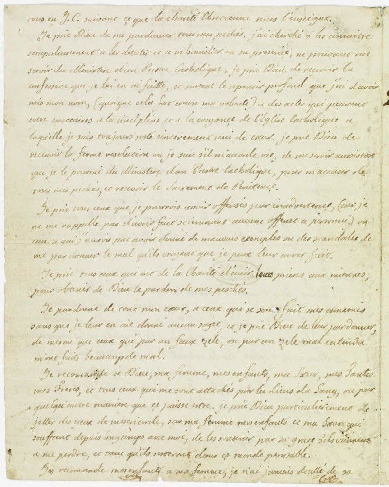 Je meurs dans l'union de notre Sainte Mère l'Église catholique, apostolique et romaine qui tient ses pouvoirs par une succession non interrompue de saint Pierre auquel J.C. les avait confiés. Je crois fermement tout ce qui est contenu dans le symbole et les commandements de Dieu et de l'Église, les sacrements et les mystères tels que l'Église catholique les enseigne et les a toujours enseignés, je n'ai jamais prétendu me rendre juge dans les différentes manières d'expliquer les dogmes qui déchirent l'Église de J.C., mais je m'en suis rapporté et rapporterai toujours si Dieu m'accorde vie, aux décisions que les supérieurs ecclésiastiques unis à la Sainte Église catholique donnent et donneront conformément à la discipline de l' Église suivie depuis J. C. Je plains de tout mon cœur nos frères qui peuvent être dans l'erreur, mais je ne prétends pas les 1es juger, et je ne les aime pas moins tous en J. C. suivant ce que la charité chrétienne nous l'enseigne.
