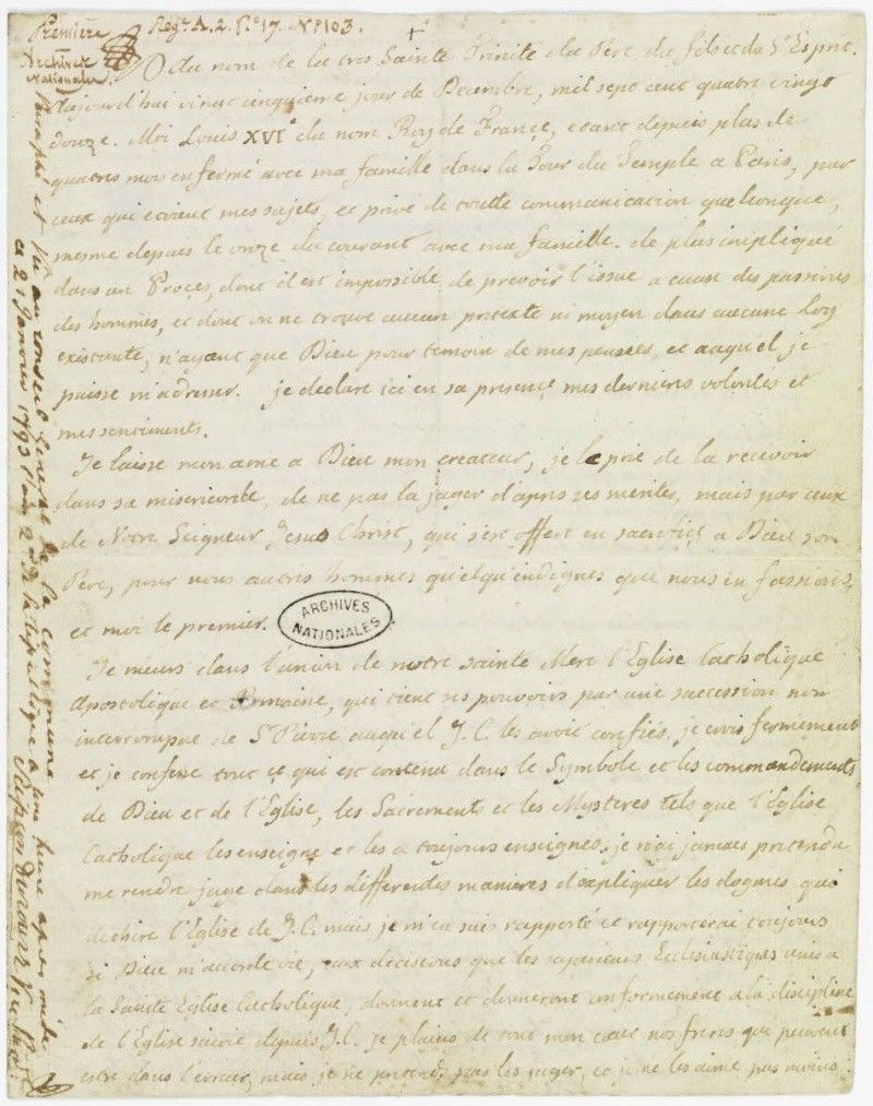 "Au nom de la Très Sainte Trinité, du Père, du Fils et du Saint-Esprit, aujourd'hui vingt-cinquième jour du mois de décembre mille sept cent quatre -vingt douze. Moi, Louis seizième du nom, roi de France, étant depuis quatre mois enfermé dans la Tour du Temple, à Paris, par ceux qui étaient mes sujets et privé de toute communication quelconque même depuis le onze du courant avec ma famille, de plus impliqué dans un procès dont il est impossible de savoir l'issue à cause des passions des hommes, et dont on ne trouve aucun prétexte ni moyen dans aucune loi existante, n'ayant que Dieu pour témoin de mes pensées et auquel je puisse ni 'adresser, le déclare ici en sa présence mes dernières volontés et sentiments.