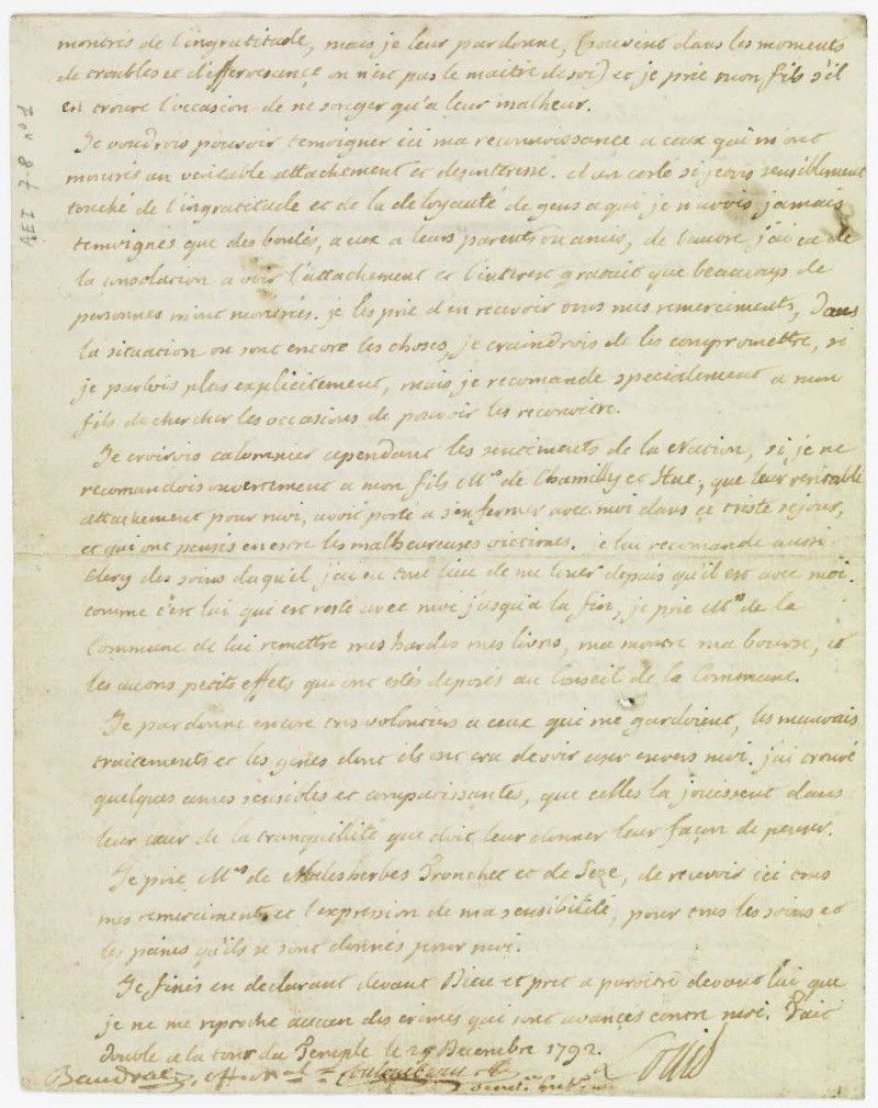 Je croirais cependant calomnier les sentiments de la Nation, si je ne recommandais ouvertement à mon fils MM. de Chamilly et Stal que leur sensible attachement pour moi avait porté à s'enfermer avec moi dans ce triste séjour et qui ont pensé en être les malheureuses victimes. Je lui recommande aussi Cléry des soins duquel j'ai eu tout lieu de me louer depuis qu'il est avec moi. Comme c'est lui qui est resté avec moi jusqu'à la fin, je prie MM. de la Commune de lui remettre mes hardes, mes livres, ma montre, ma bourse et les petits effets qui ont été déposés au Conseil de la Commune.